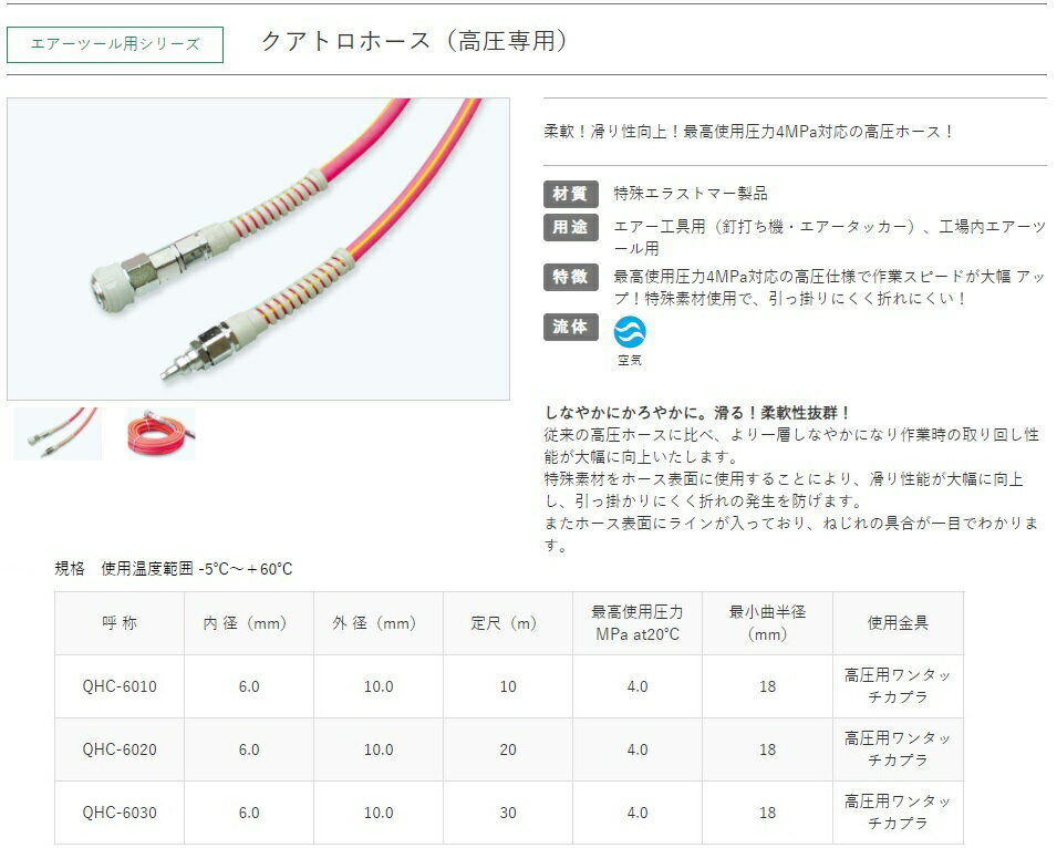 十川産業 高圧エアーホース クアトロホース 20m QHC-6020 日本製 カプラー付 高圧ホース エアホース 釘打ち機用